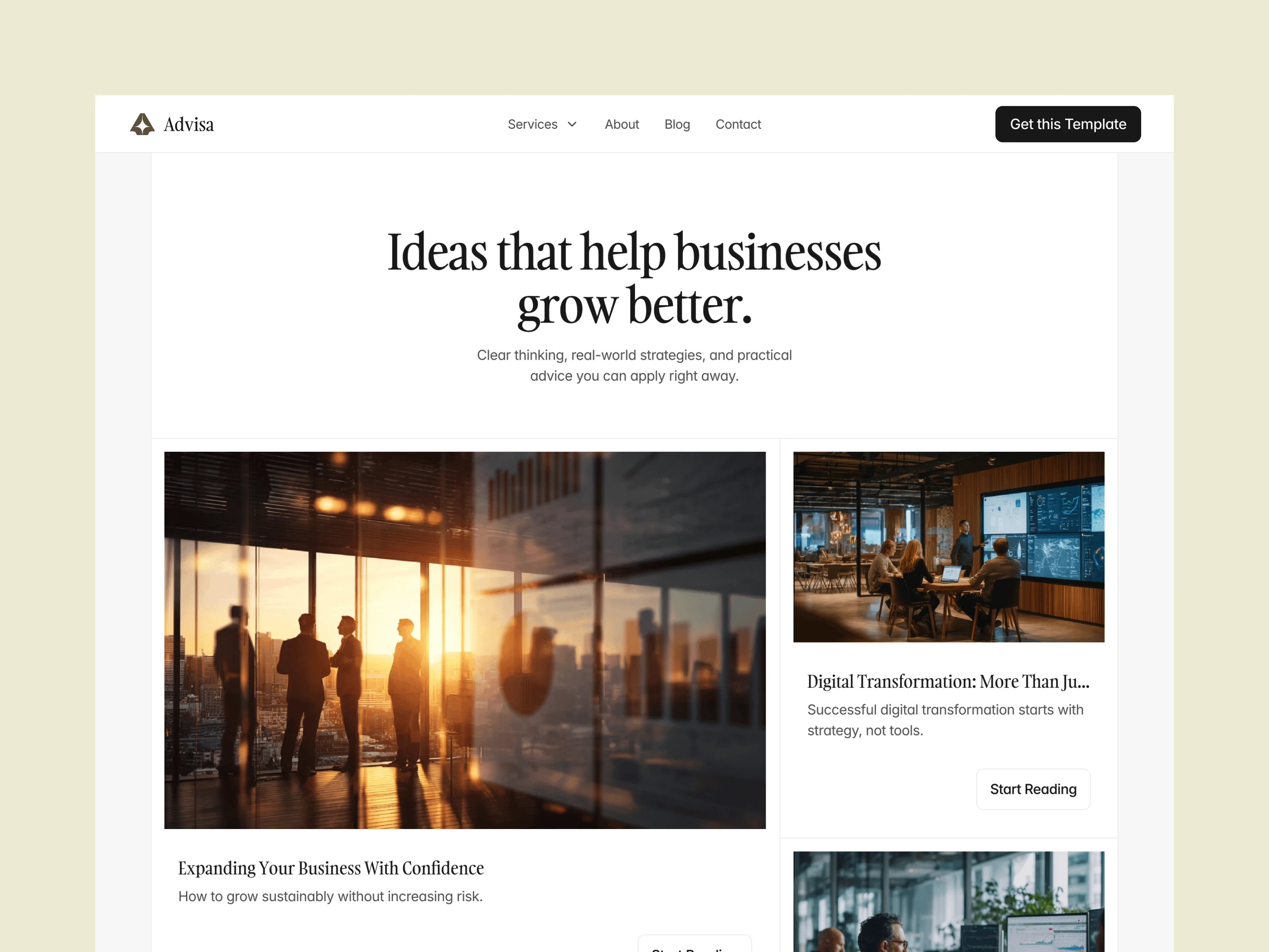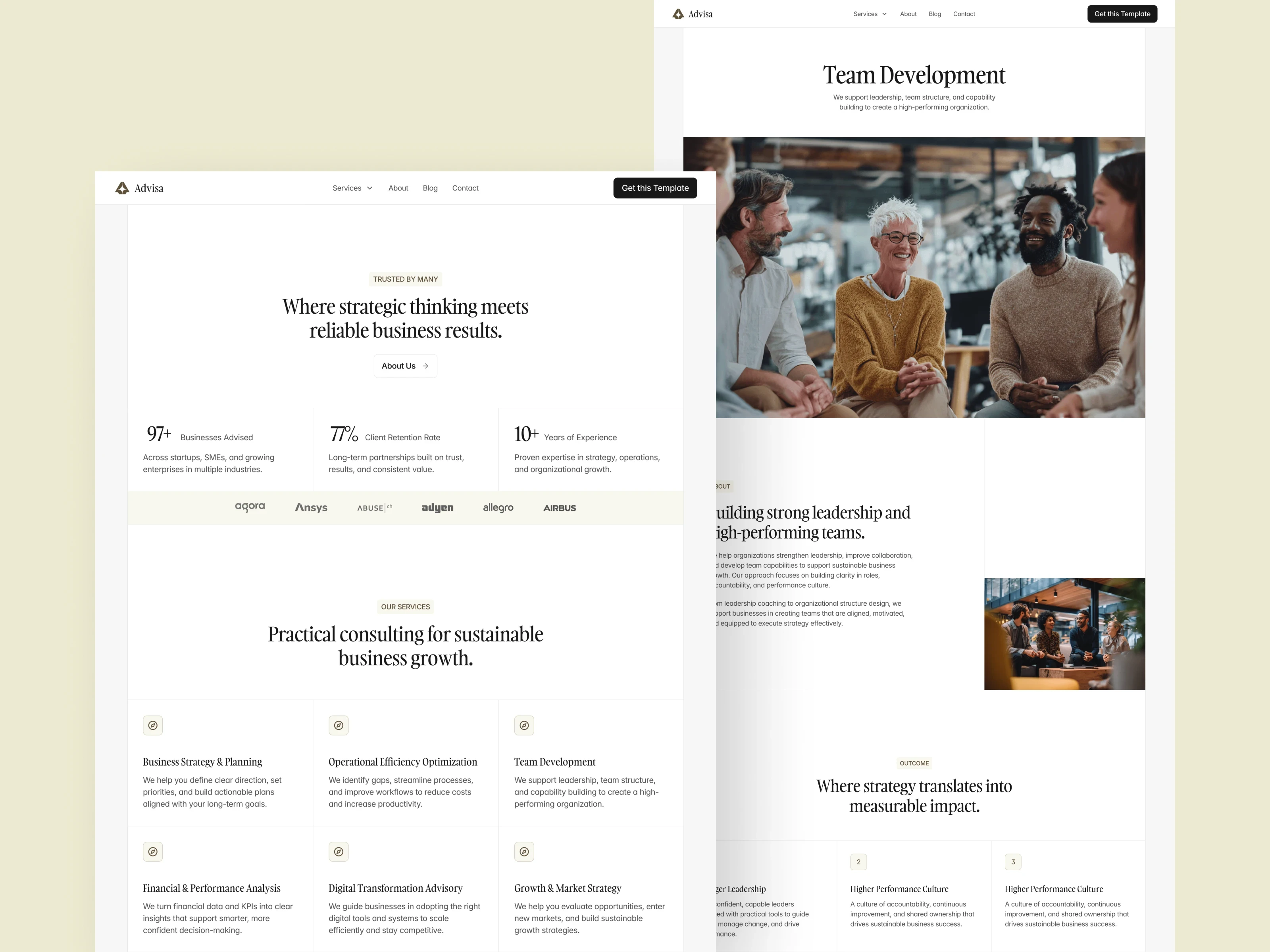 A modern business consulting website template with a calm, professional aesthetic. Designed for consultants, advisors, and strategy-focused teams who want to present their expertise with clarity, confidence, and trust.